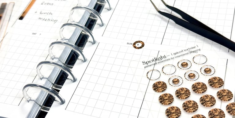 Elevate your weekly spread with our newest arrival—Spotlight – Spiced Tortoise, a patterned essential designed for intentional planning. This insert features a warm, earthy palette and a subtle tortoise shell motif that adds depth and sophistication to your layout. Whether you're mapping out meetings or marking moments of calm, these stickers bring texture and elegance to your planner pages. Perfect for planners and lovers of quiet luxury, this set is ideal for layering, highlighting, and creating visual rhythm in your routine.
